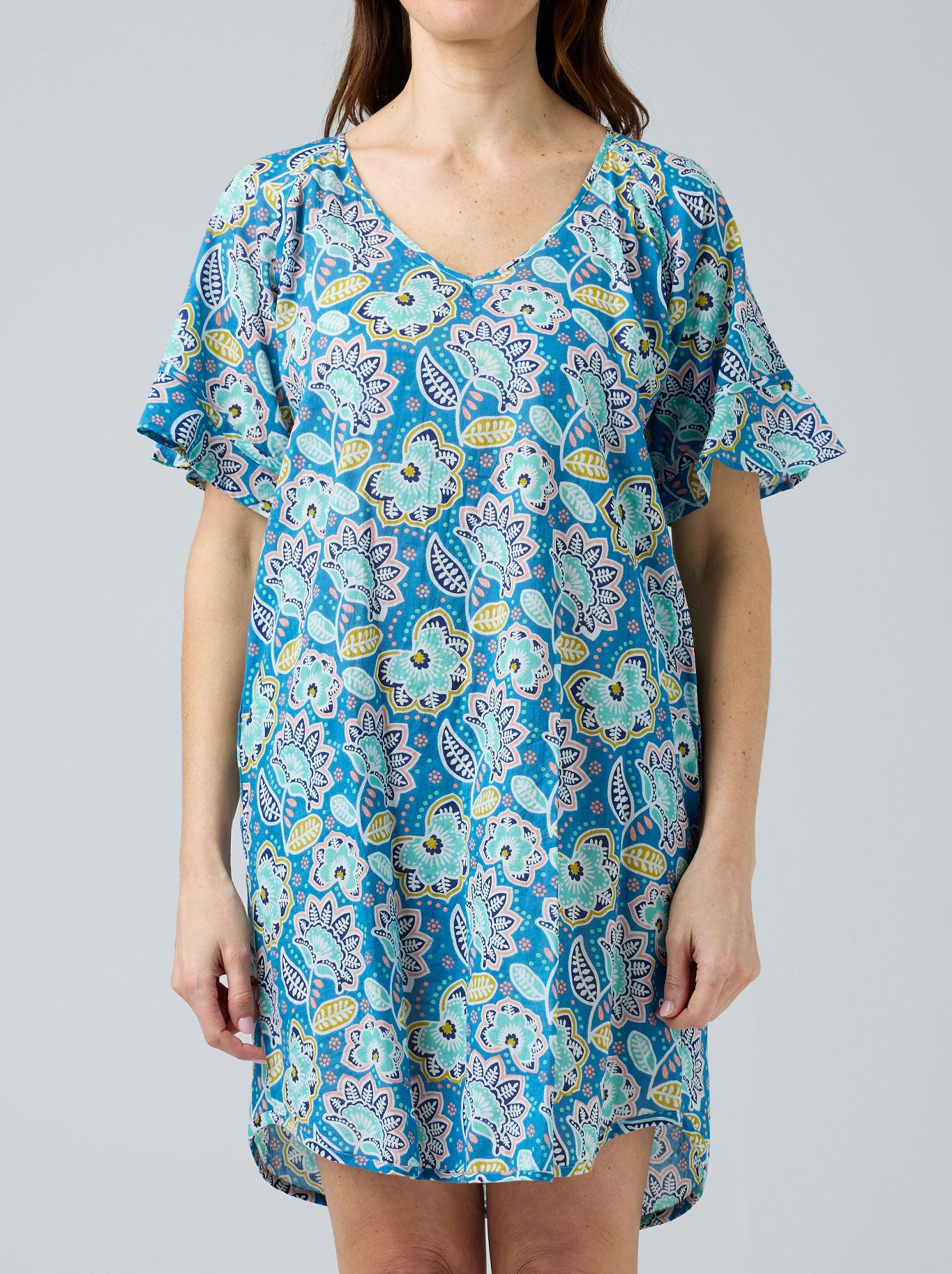 The Kim Dress from Cake is crafted from 100% cool, fine cotton, features elbow-length raglan sleeves with soft ruffle cuffs for added charm. Designed for a relaxed fit, it offers a curved 'to the knee' hemline (model is 5'10") and a flattering V-neckline, making it both comfortable and effortlessly stylish. Available in a variety of playful new prints!