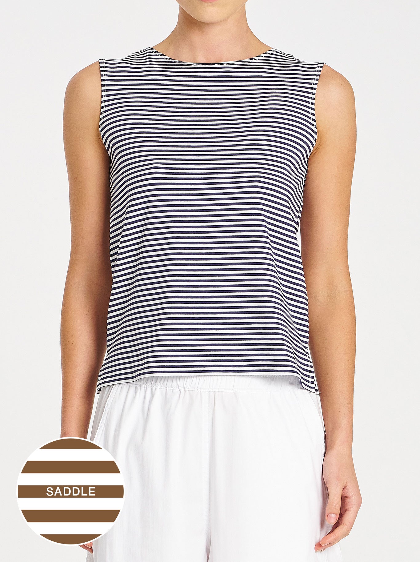 A Core Mela Purdie staple, the Palazzo Shell is a timeless silhouette. Crafted in the Yacht Stripe Jersey featuring small side splits and subtle rounded neckline, this piece is a wardrobe essential.
