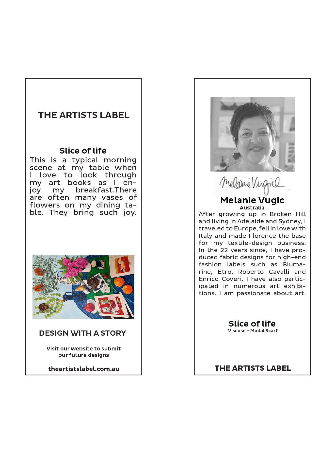 Melanie Vugic, a celebrated Australian textile designer, captures everyday beauty with The Artists Label Slice of Life Scarf. Crafted from soft viscose, this vibrant accessory showcases a rich palette inspired by a table of art books and vases, effortlessly complementing monotone outfits. Its lightweight, breathable fabric ensures comfort while adding a sophisticated splash of colour to your wardrobe.