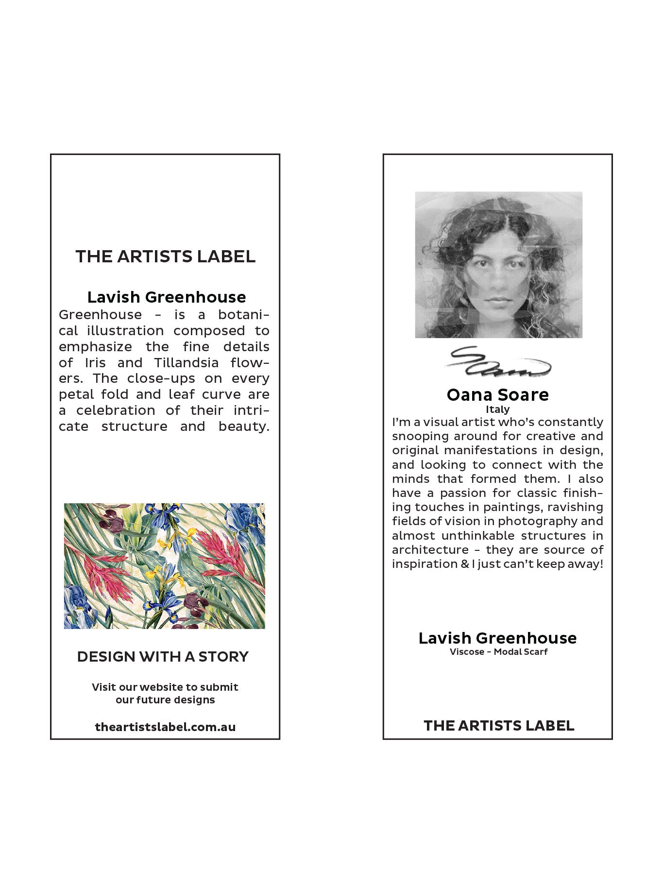 The Artists Label Lavish Greenshouse Scarf showcases an exquisite botanical illustration by Italian artist Oana Soare, capturing the intricate beauty of Iris and Tillandsia flowers. Printed on soft viscose, the scarf features muted shades accented with subtle hints of color that harmonize effortlessly with denim and white ensembles. This piece reflects a sophisticated blend of painting, photography, and architectural influences for a refined, wearable work of art.