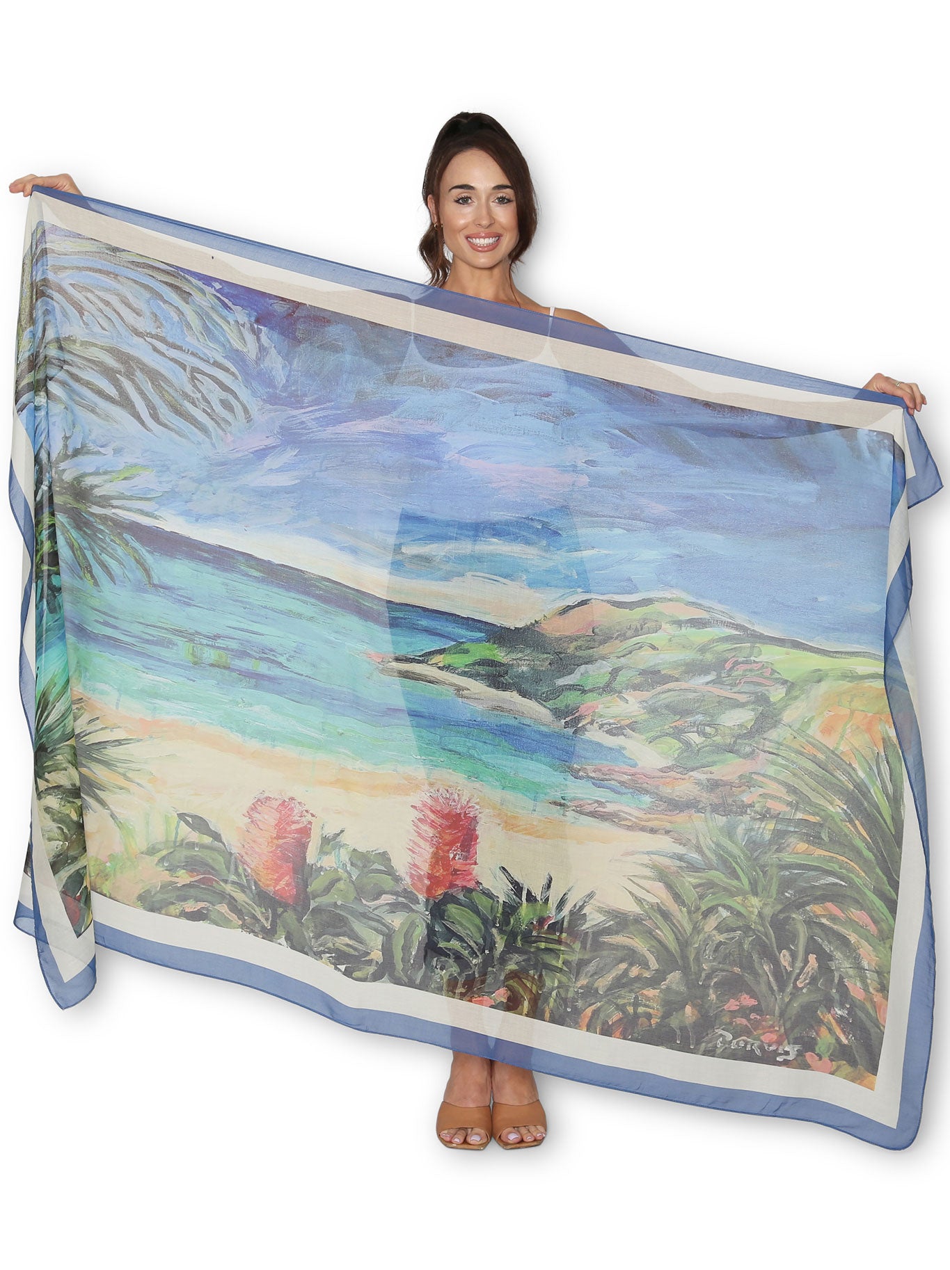 The Artists Label Sunshine Coast Scarf showcases award-winning artist Trevor Purvis’s evocative beach scenes through refined colour palettes and subtle topographic detail. This voluminous scarf offers versatile styling as a wrap, sarong, or statement accessory, delivering both comfort and artistic sophistication. An elegant piece that effortlessly complements refined wardrobes, it celebrates the natural beauty of Queensland’s coastline while providing adaptable wear for various occasions.