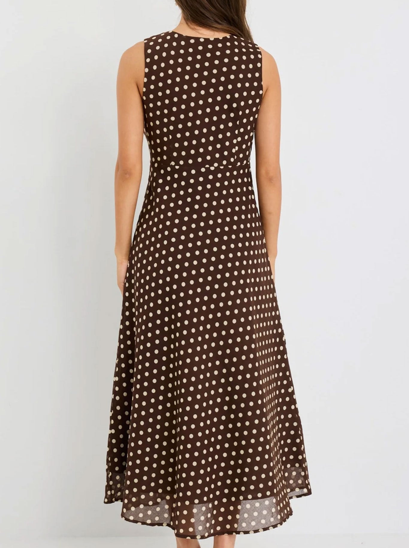 Timeless and playful, the Infinity Polka Midi Dress from Among The Brave is a sleeveless bias-cut midi designed in a rich chocolate base with a classic polka dot print. The V-neckline is finished with a delicate tie detail for a feminine touch, while the bias cut drapes beautifully to flatter the figure. Fully lined for comfort, this dress is crafted from a breathable cotton-linen blend, making it an effortless choice for day-to-night styling.
