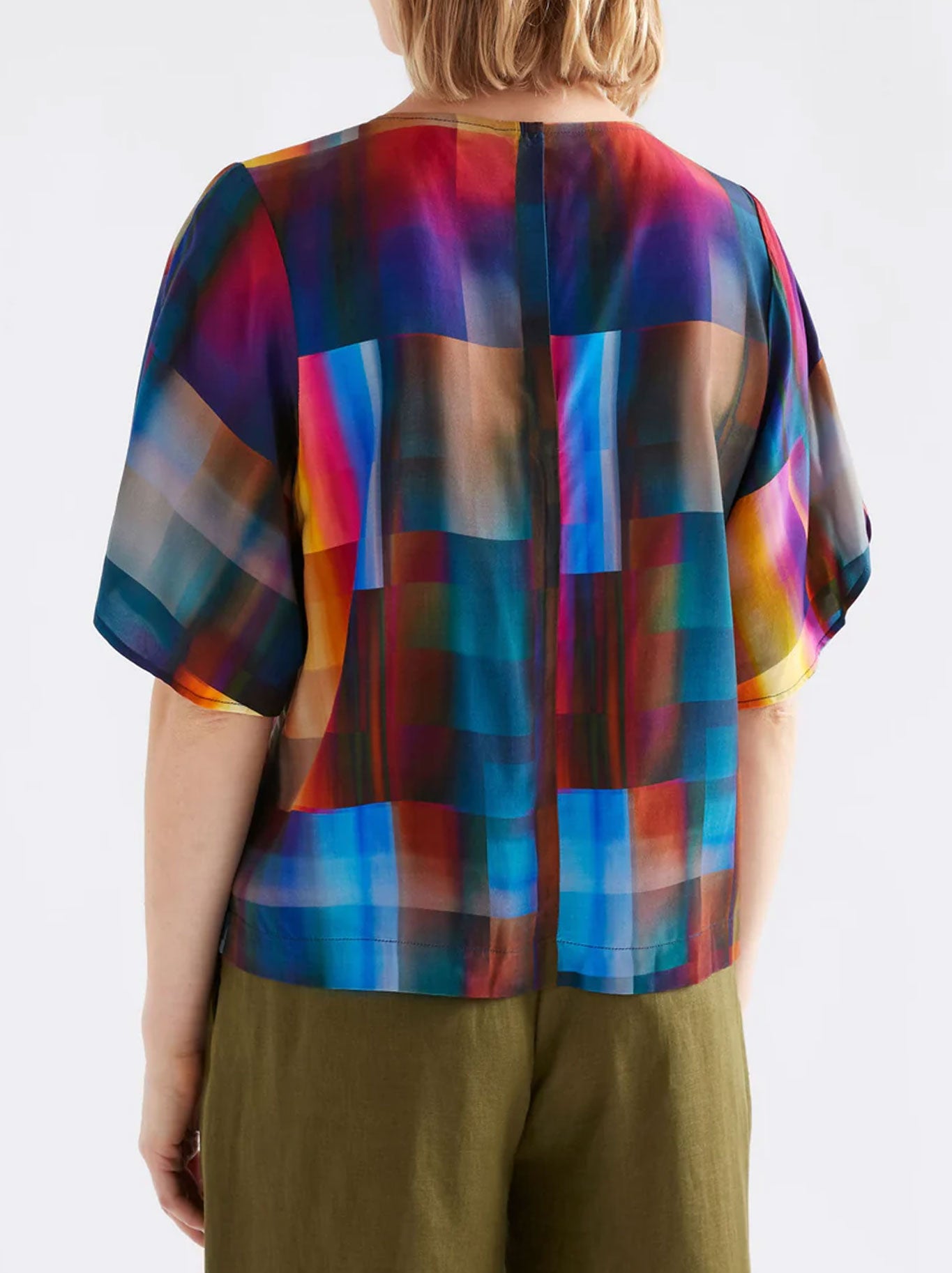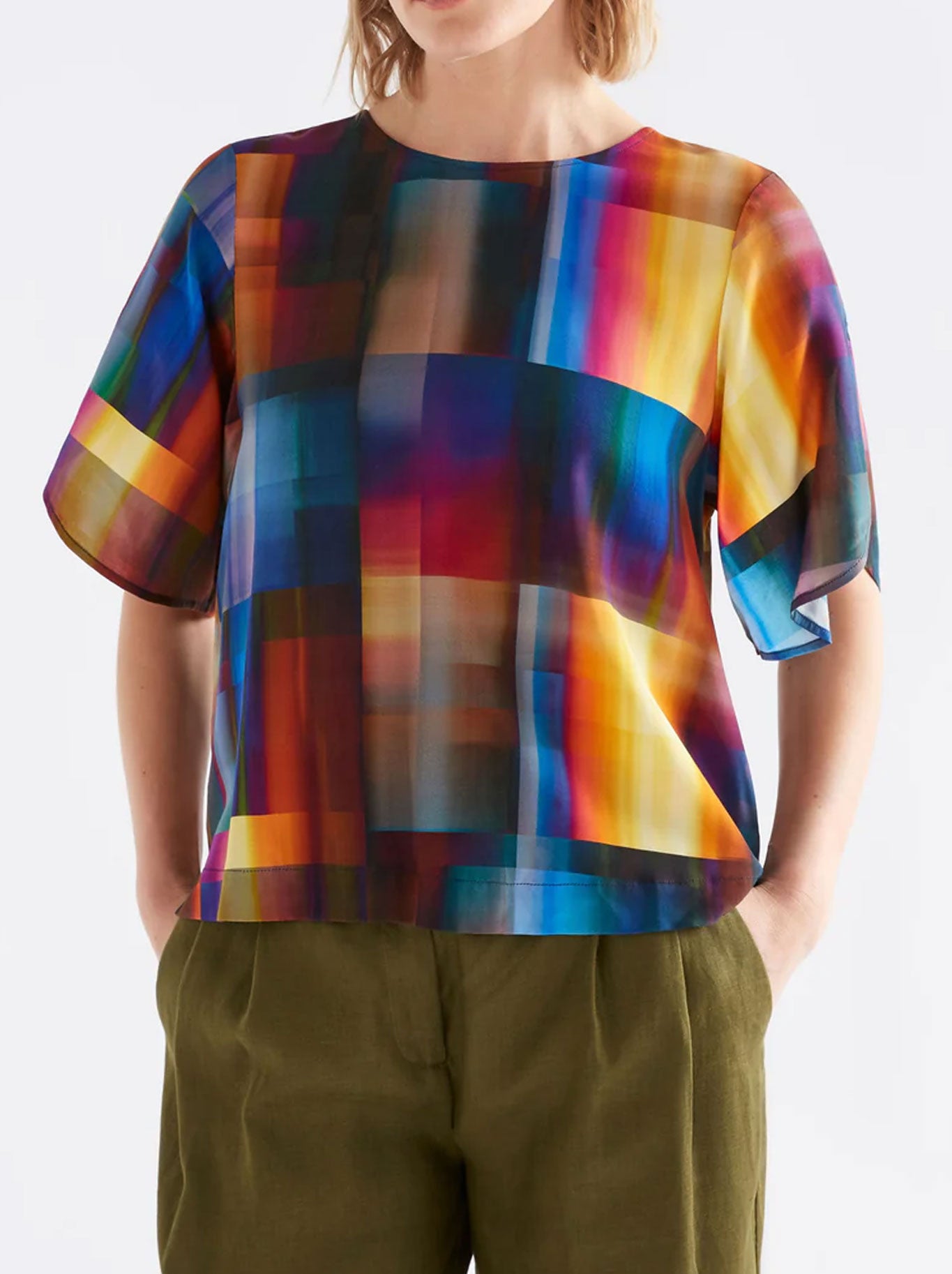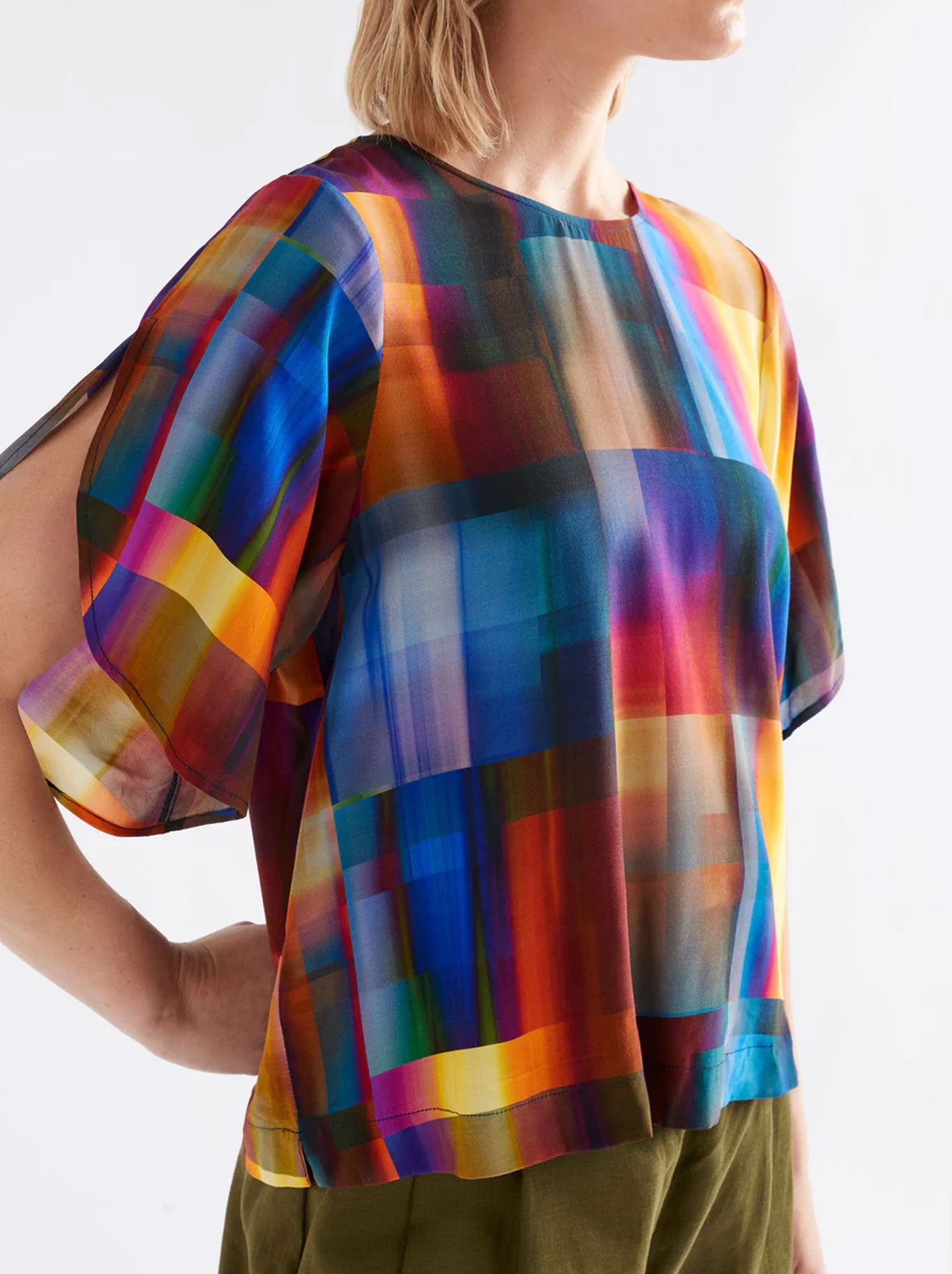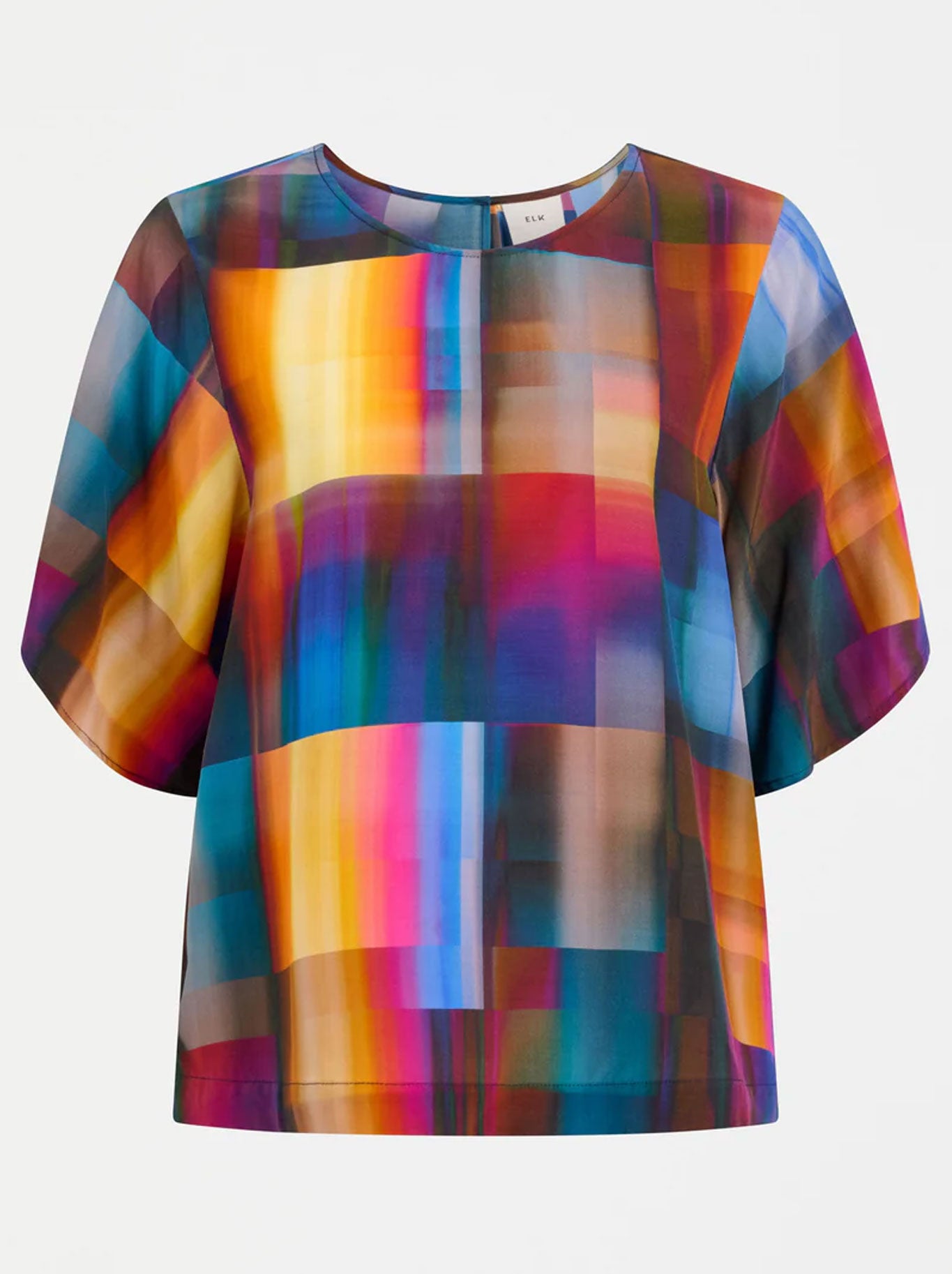 The Elk Byde Top is a classic silhouette with thoughtful design details. Printed in the vibrant Ekko Print, this top features short raglan, tulip sleeves that elongate and flatter the arm, while providing coverage. The simple crew neckline and centre back neck placket with press stud closure a provide a clean silhouette for the print to take centre stage. Crafted from a silky soft ECOVERO™ viscose blend that is floaty and lightweight with a matte sheen. A regular fit bust flows into a slightly relaxed A-line hem. Pair with tailored pants for desk-to-dinner outfitting.