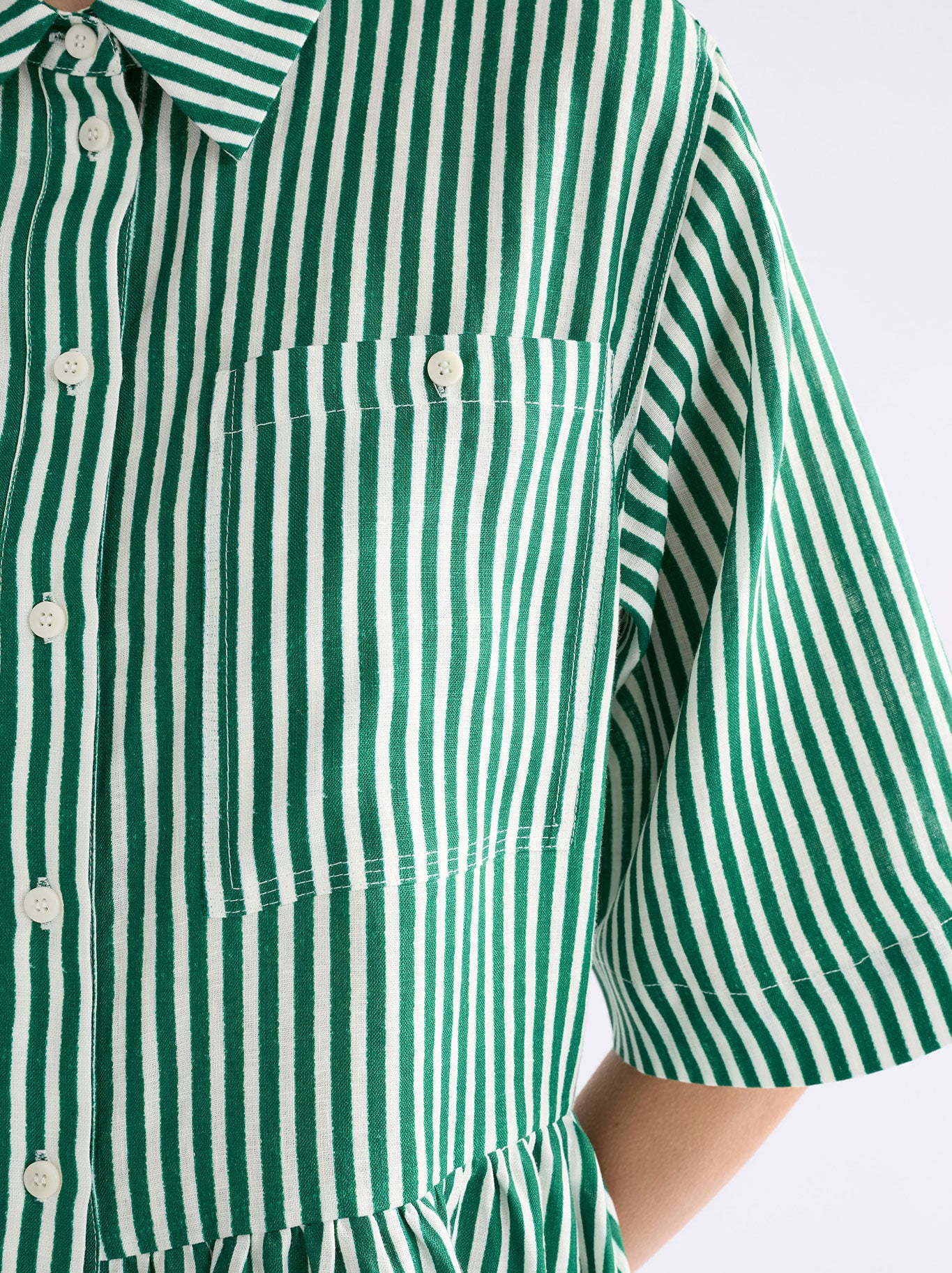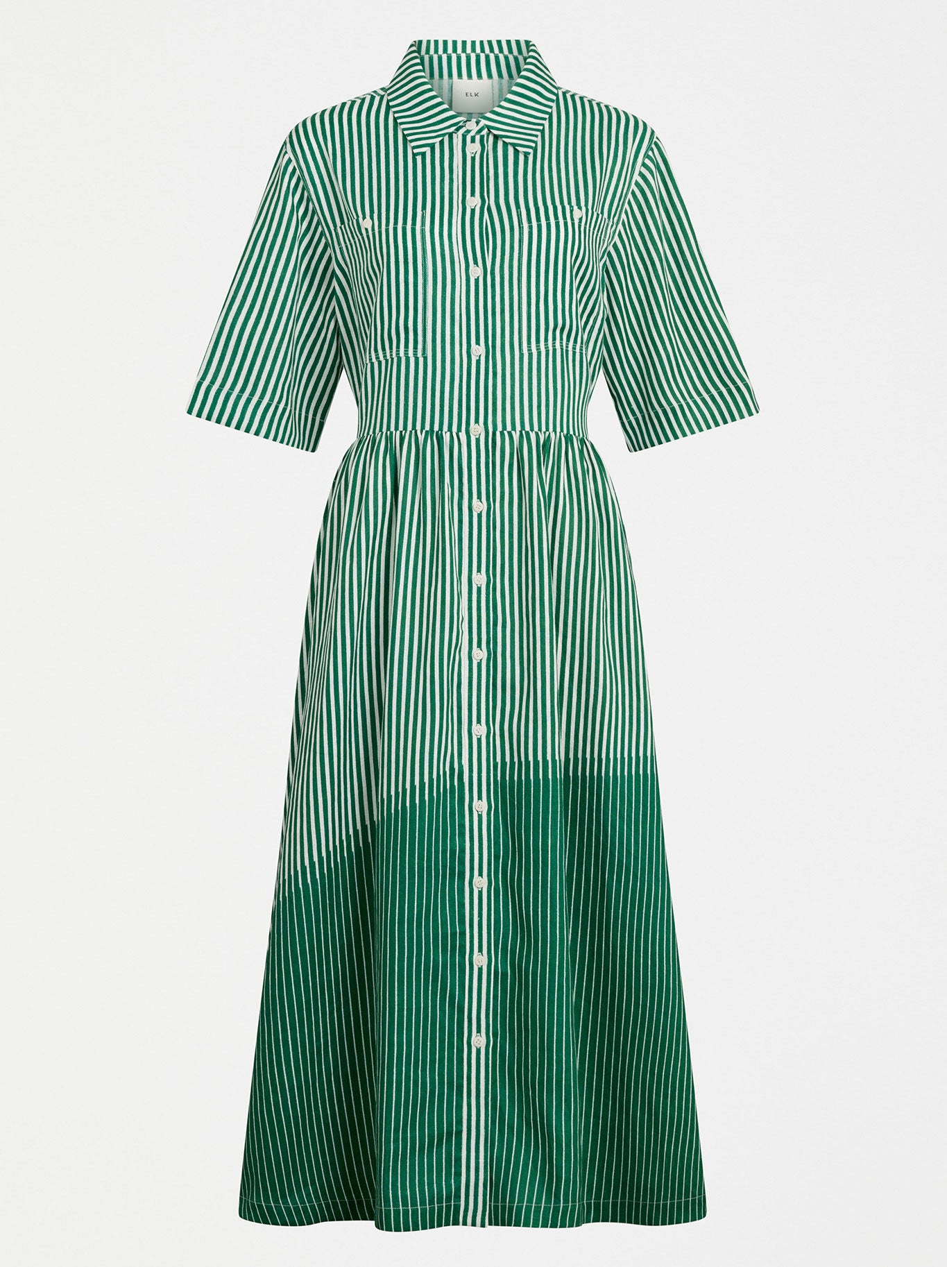 The Linen Dress by Elk the Label redefines relaxed elegance in 100% French linen featuring the striking 'ortler print'. This shirt dress features a button through design and collar, flowing into A-line silhouette with a gathered skirt. A mid to long length dress with flattering elbow length sleeves and two chest patch pockets. French linen is durable and slightly textured and will soften with wear. Your new go-to-spring-summer piece.