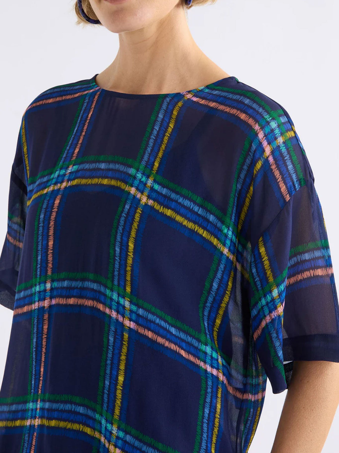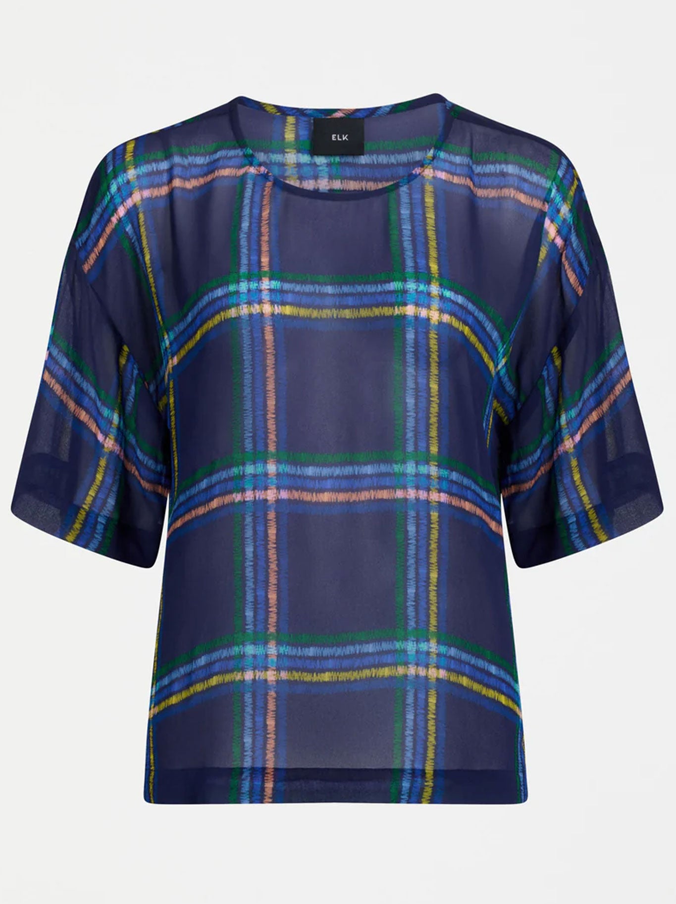 The Elk Statte Top is a relaxed, boxy fit style with dropped shoulders and a slightly cropped length. Crafted from a lightweight, slightly sheer viscose with a crinkled texture that floats over the body with soft drape. Style tucked in with high-waisted pants or wear out over straight-slim leg pants. This bold check print is a yardage print, meaning each garment has unique placement.