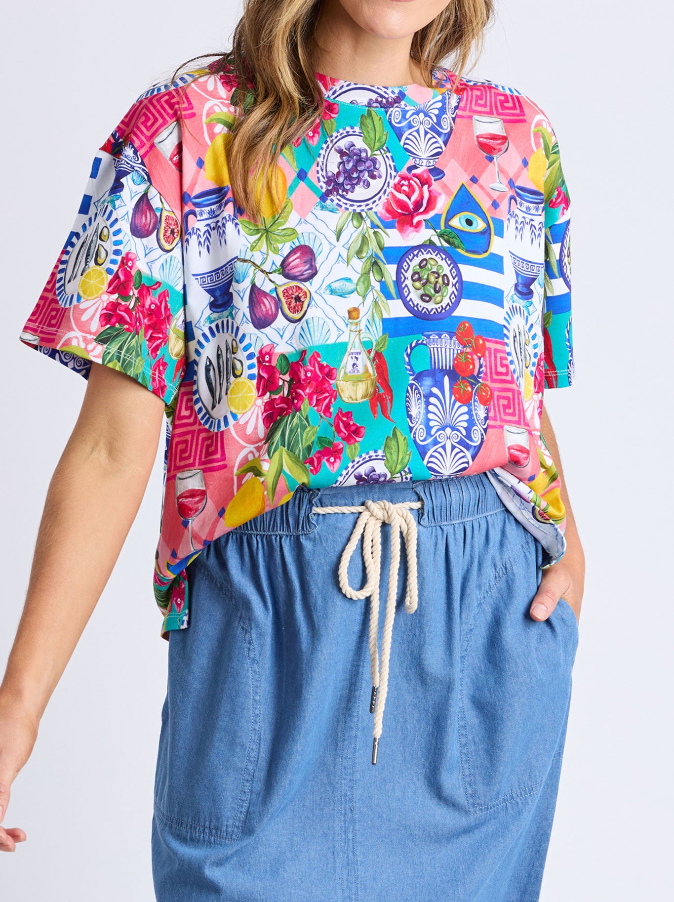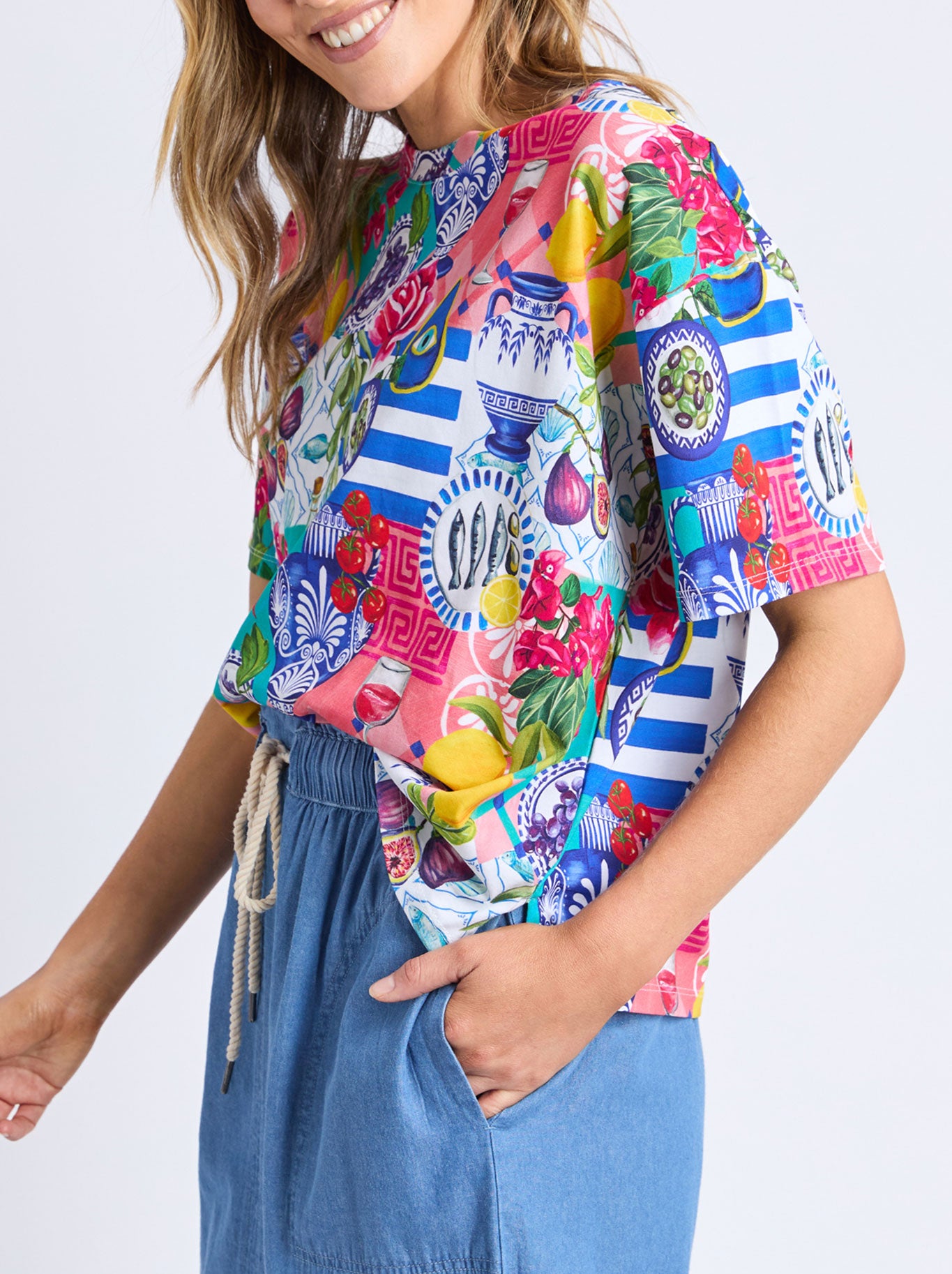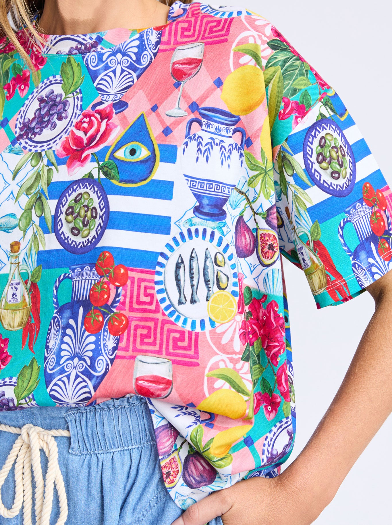 Designed exclusively with La La Land's talented artist, Murilo Manzini, this stunning Elm tee is a standout piece for this Summer. Featuring their exclusive Mediterranean Summer print, we invite you to take a mental vacation through ancient sun-kissed villages along the Mediterranean Sea and discover collaged scenes depicting the unique beauty of Greece, Italy, and all the stunning secret spots in between.
