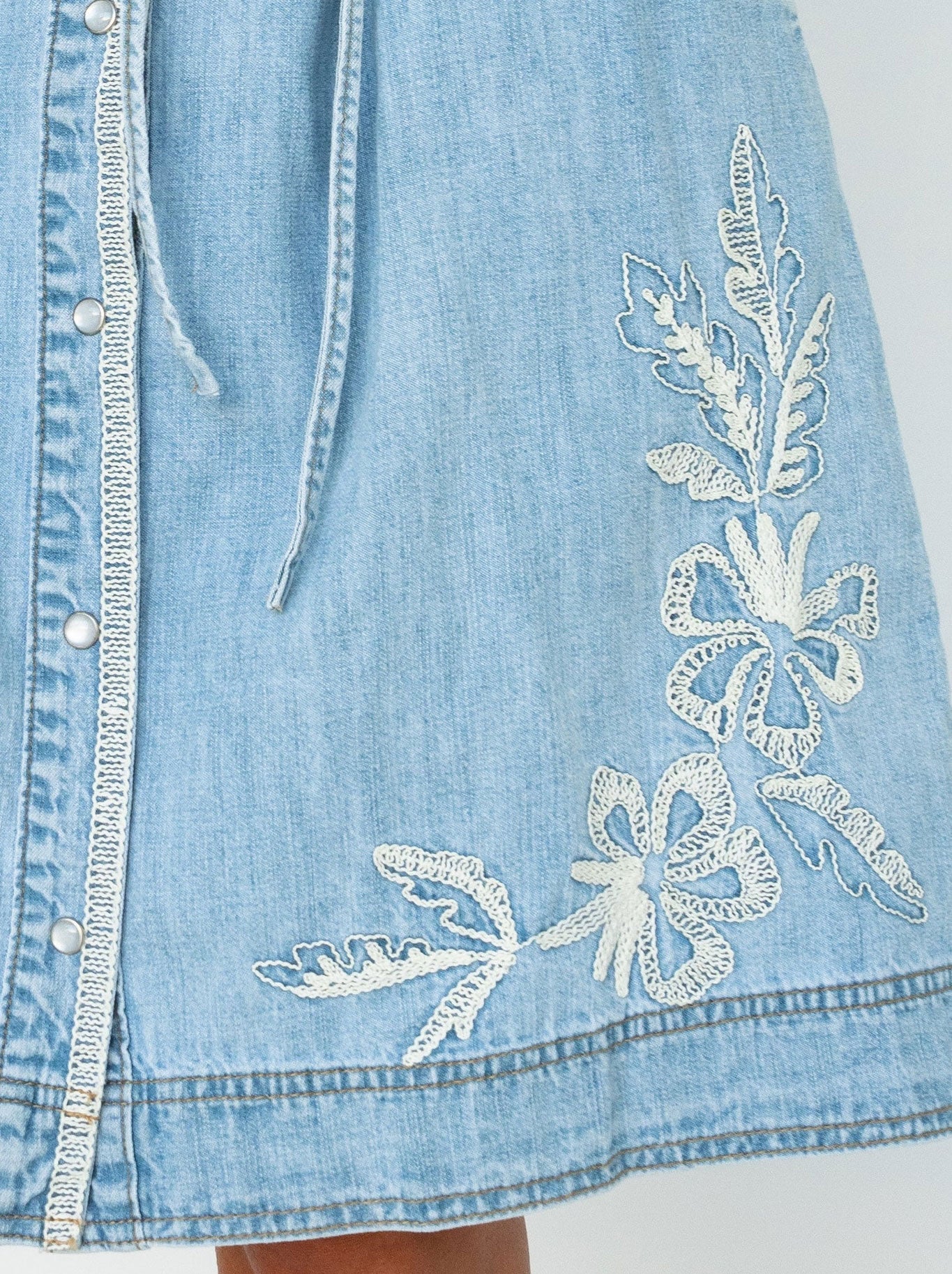 The Simone Dress by Kireina is the easy mini shirtdress with a cool twist. Featuring patch utility pockets, buttons all down the front and an embroidered floral detail this is one-and-done kind of style that can be paired with sneakers for a cool, casual vibe.