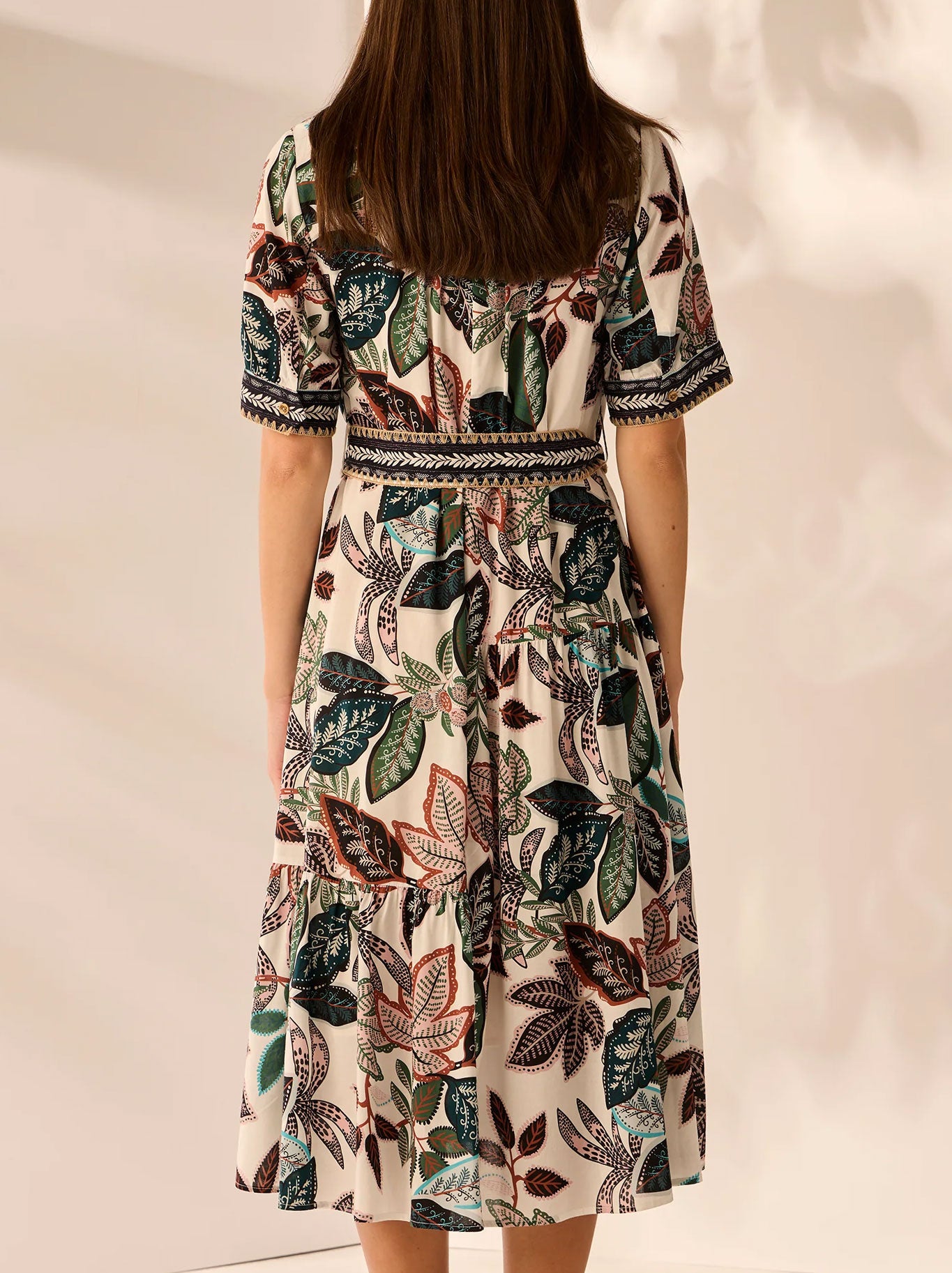 The Carnaby Dress by Lania the Label is a perfect balance of elegance and artisanal charm, featuring a mid-calf length silhouette with a flowing high-low gathered hem. Thoughtful details like blanket stitch embroidery on the belt and cuffs, a border print accent, and a centre-front placket with wooden buttons make this a standout piece for effortless styling.