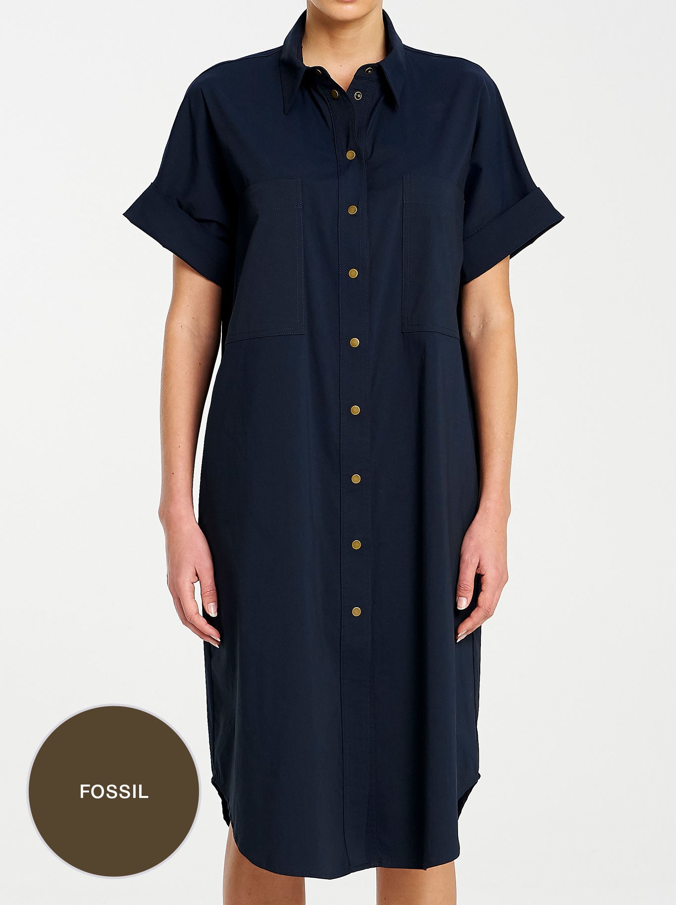 Cut from Microprene, a crisp, cotton rich, high stretch fabrication with a polished finish the Stud Shell Dress is a clean silhouette featuring a stud button closure and chest pockets.