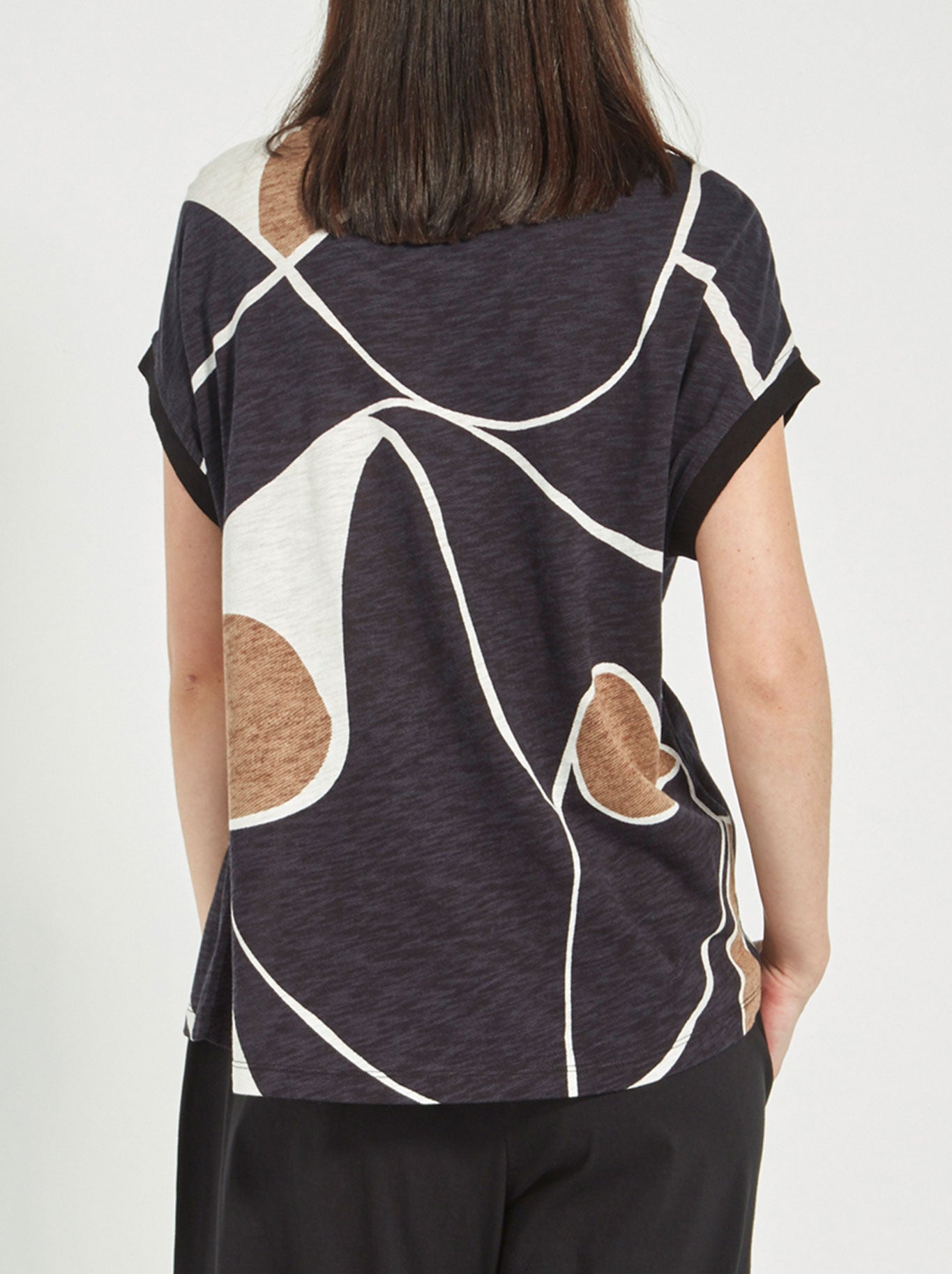 This beautiful new season printed Verge top combines cotton and modal for a soft, comfortable feel, featuring extended shoulder sleeves for a modern silhouette. It has a rounded neckline and sleeves finished with black ribbed trim. A sequin detail at the front adds subtle shine. The Genesis Top is designed to sit at hip length, offering a flattering fit.