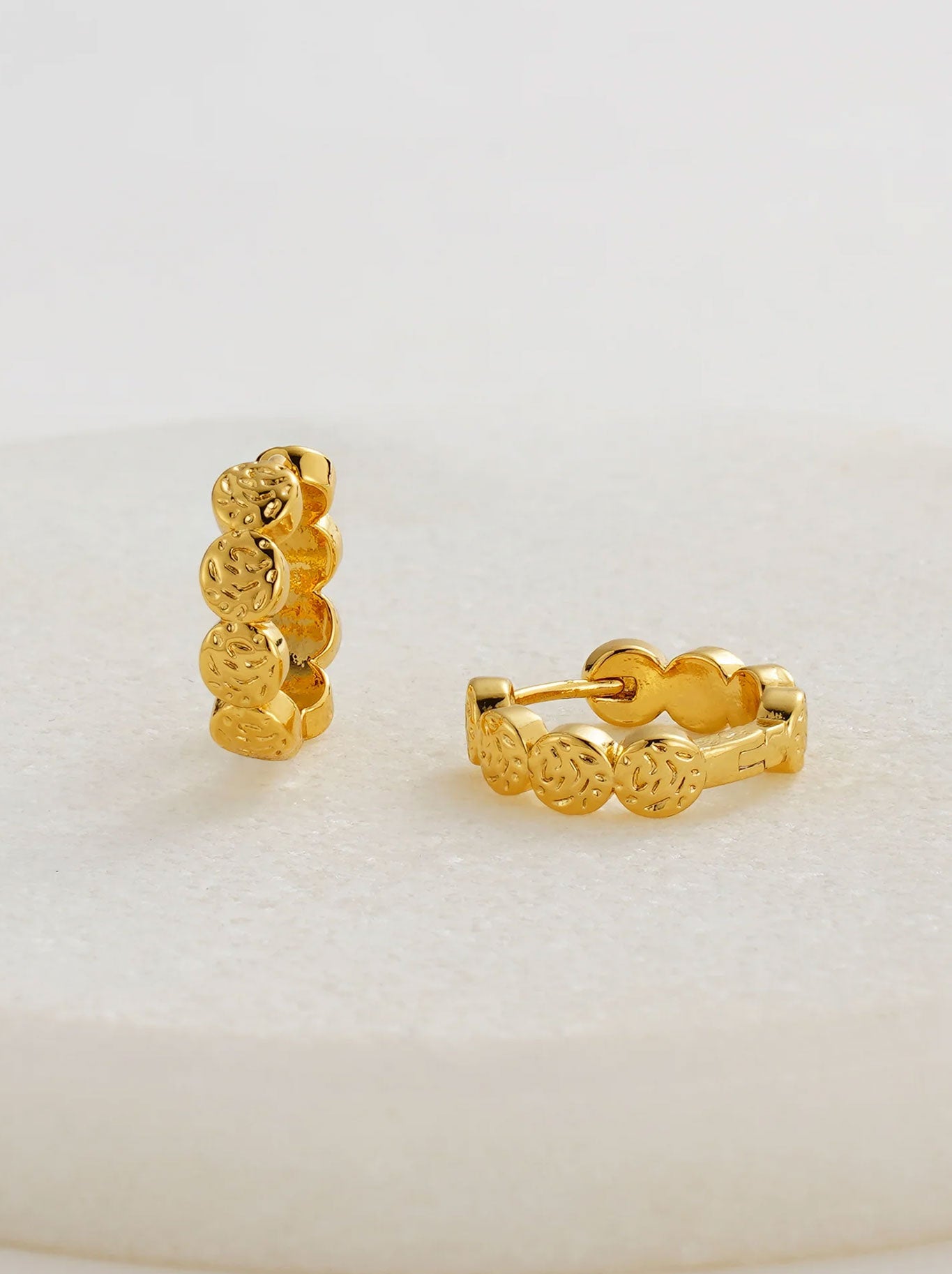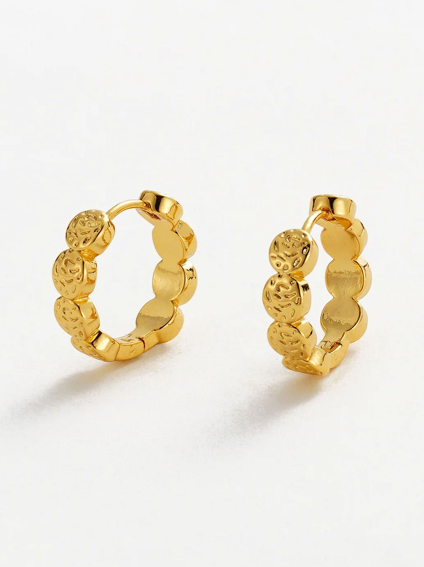 The Zafino Josie Huggie is a textured small hoop that brings subtle detail to a timeless silhouette. Featuring an intricate embossed design in a polished gold finish, this huggie is lightweight, versatile, and perfect for everyday wear. Style solo for understated elegance or stack with other hoops and studs for a layered ear.