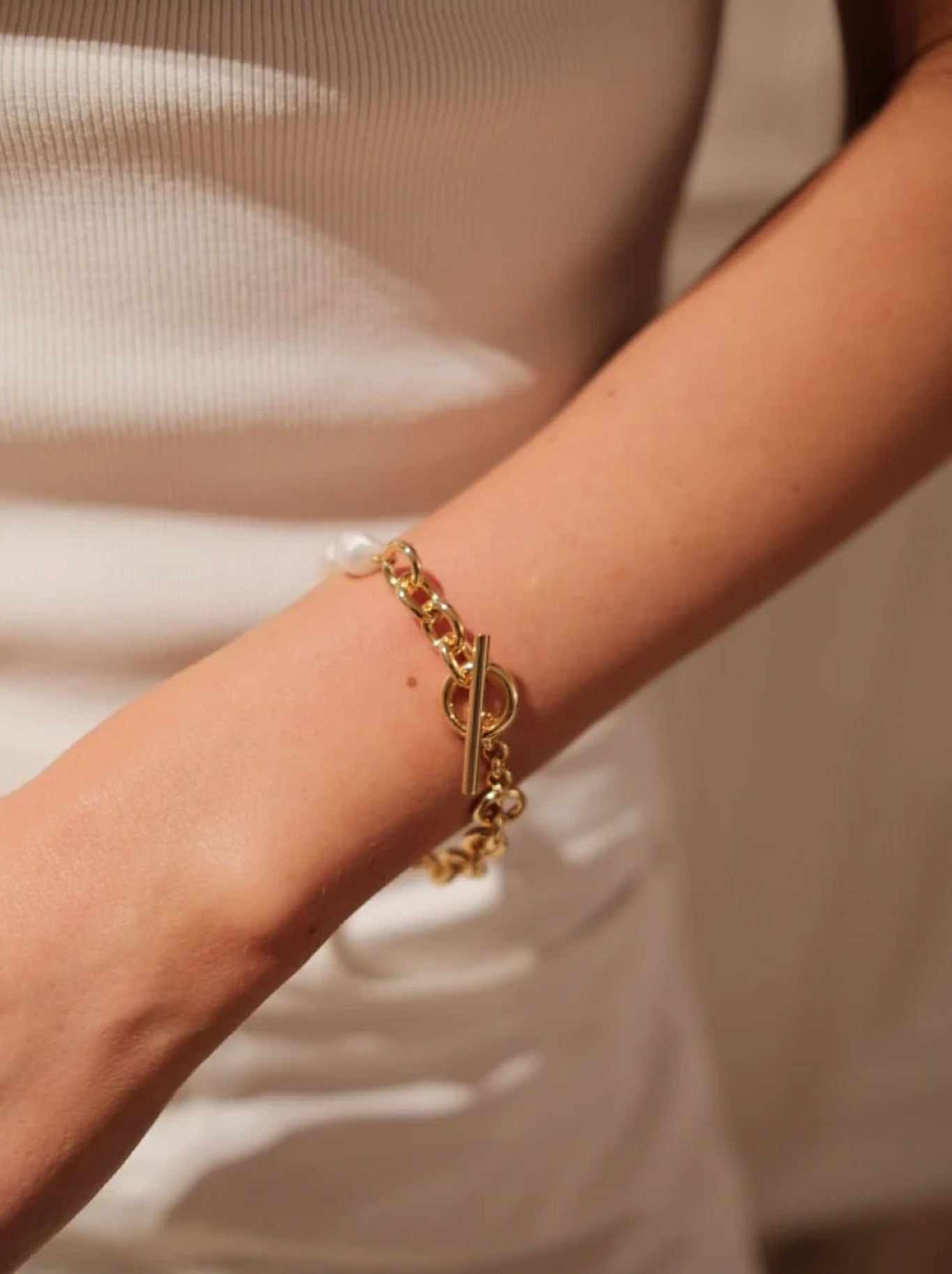 The Zafino Eliza Bracelet combines modern boldness with timeless charm. Featuring a half-and-half design of lustrous freshwater pearls and gold link chain, it’s finished with a classic fob clasp for an elevated touch. Perfect for everyday wear, this bracelet brings balance, elegance, and versatility to your jewellery collection.