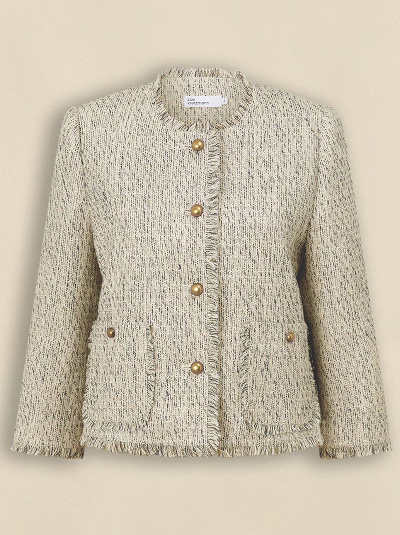 A refined take on Summer layering. The Zoe Kratzmann Zeal Jacket combines delicate details with soft texture, offering polish with a romantic sensibility. This cropped jacket features a fringe-trim finish and feminine round neckline. From coastal escapes to city commutes, it’s the perfect trans seasonal layer.